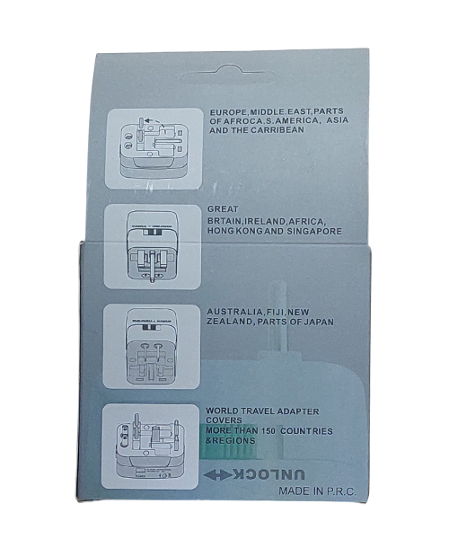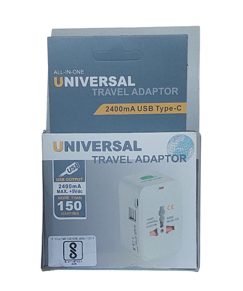- This universal adaptor is a compact one-piece unit with 4 international adaptors, and provides a child protection safety shutter, power indicator light and surge protector. This item with fit the plugs in Europe/UK/USA/China/Japan/Australia/Spain and almost every country in the world. The USB charge is 5Vdc 2400mA.